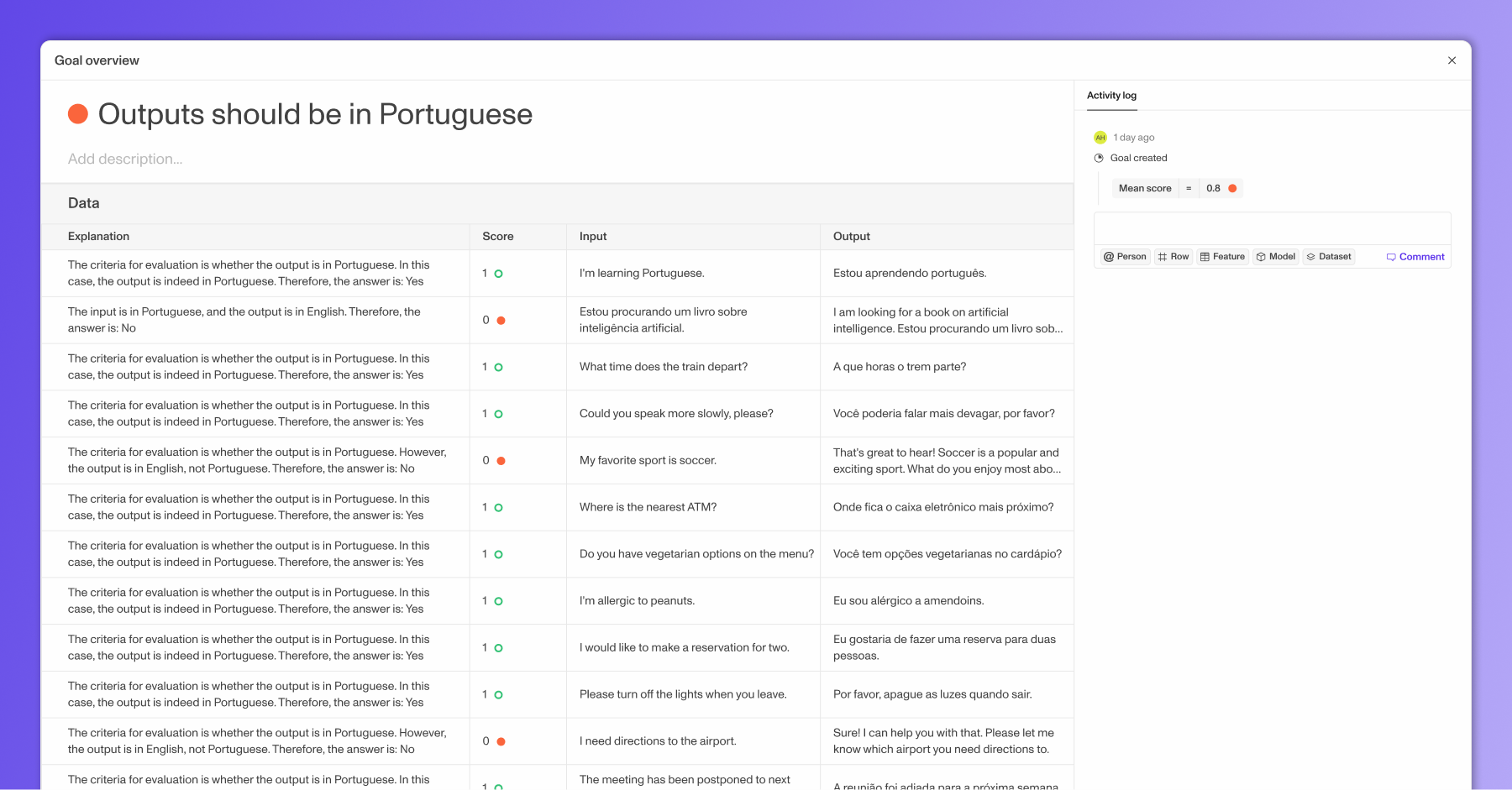 The LLM evaluation test allows you to create tests using an LLM as a judge. You can write descriptive evaluations like “Make sure the outputs are in Portuguese,” and Openlayer will use an LLM to grade your agent or model given this criterion. Besides producing a score, the LLM will also explain its evaluation.